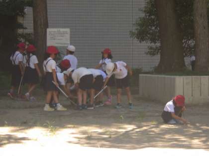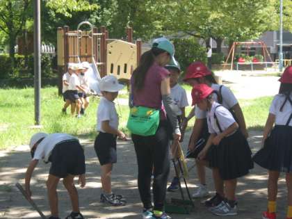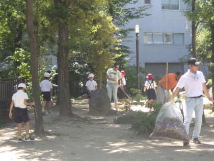 まだまだ残暑が続く中、子ども達は地域の人たちとともに、みんなが使う阿波座南公園をきれいにしました。