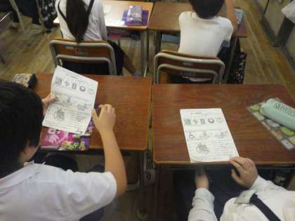 3年生は明日の車いす体験の準備として車いすについて、それぞれの部分の名称などを学習しました。