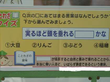 (2)諺クイズ 「実るほど頭を垂れる【  】かな。
