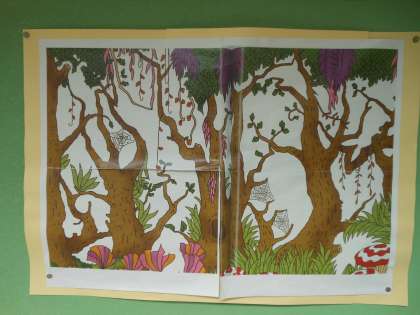 理科室横の掲示板に、「いきものみつけ」の作品