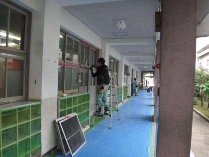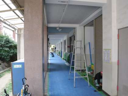 今日から2週間ほどかけて南館1Fの廊下を塗装おこないます。