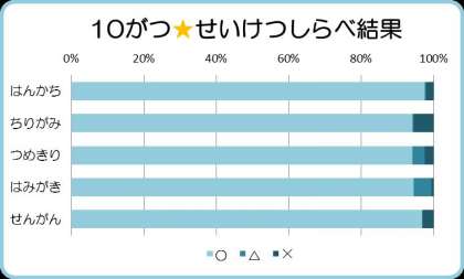 本日は10月のせいけつしらべの日でした。その結果をお知らせします。全ての項目を平均すると95%の児童が「○」を付けていました。