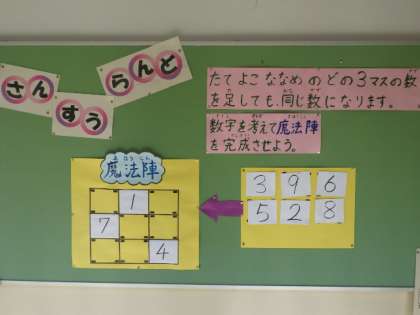 給食室前の掲示板にいろいろな人が楽しめるクイズが張り出されています。