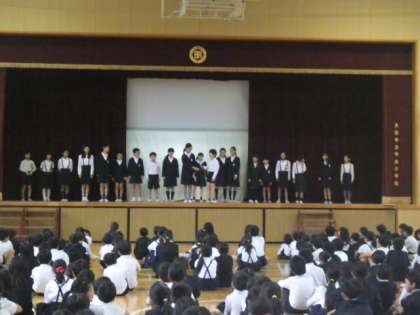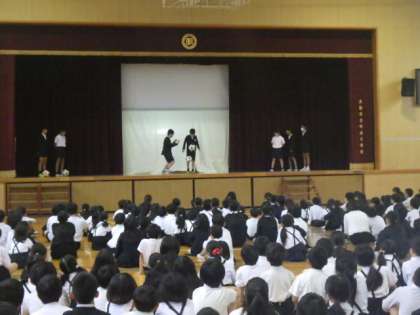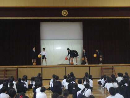 今日の児童集会はスポーツクラブと工作イラストクラブの発表がありました。