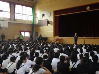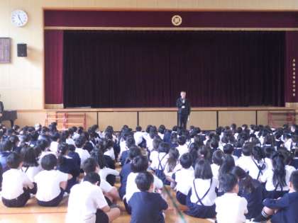 講堂へ避難の後は、警察の人から不審者に出くわした時にどういった行動をとるのかなどを教えてもらいました。