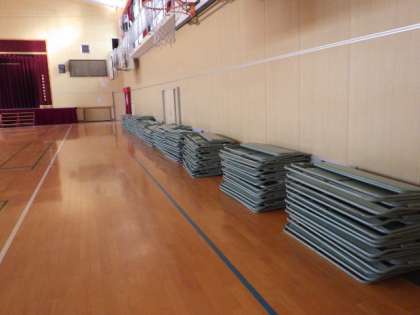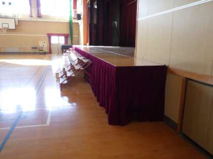 せり出し舞台とひな壇が設置され、長椅子が体育館横においてあります。