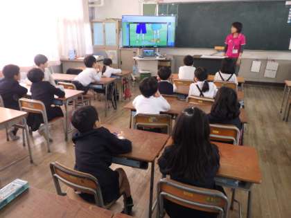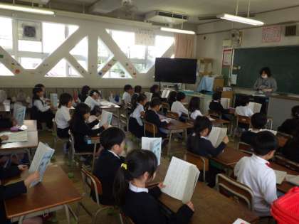 学校では掃除終了後と5時間目の間の時間をMeiji Timeとし、1年生から6年生までが映像を見ての外国語の学習をしたり、校内で作成した音読の本「Let's 音読」を使い音読学習をしたりしています。