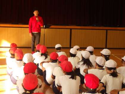 講師の先生からは、夢をもって努力することの大切さのお話の後、体操の基本となるストレッチを教えていただきました。