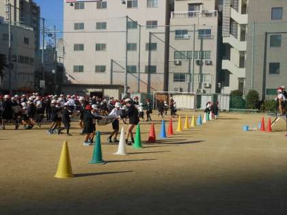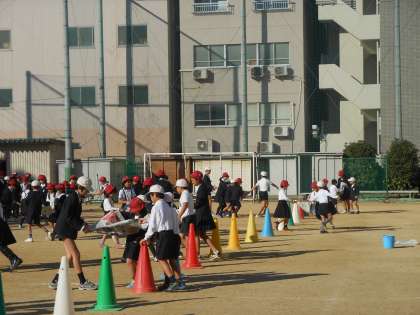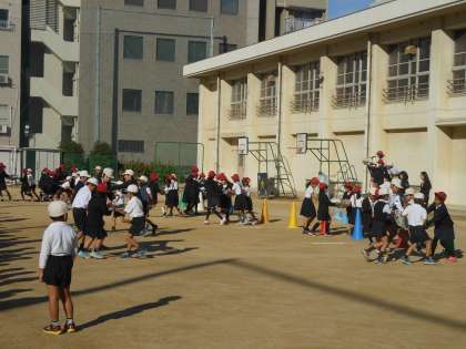 新聞紙の隅を児童たちが持ち、新聞紙の上にボールを