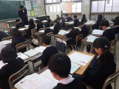 テストの間違え直しをしています。一度間違えた問題を復習して次の間違えを防ぐことが大切です。しっかりと見なおしてほしいと思います。