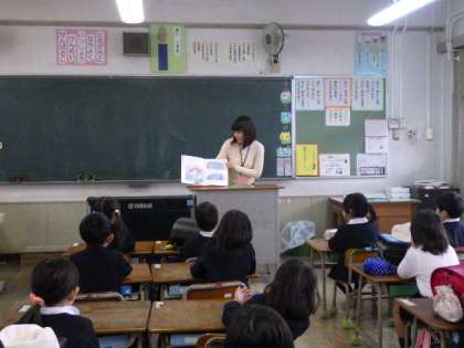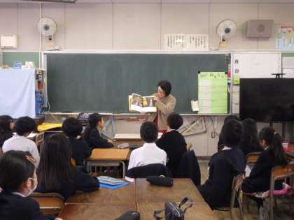 1〜4年生までの2組のクラスでぶっくらぶの人たちによる読み聞かせが行われました。