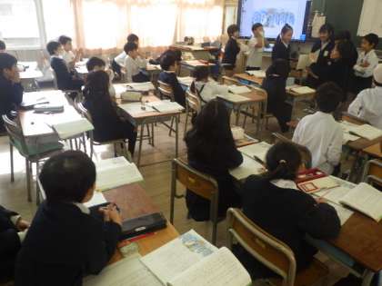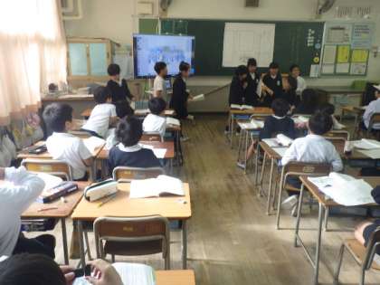 考えたことをみんなの前で発表しています。