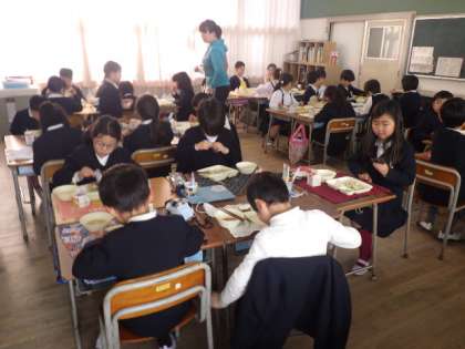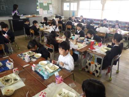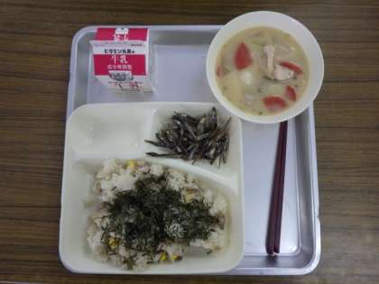 今日は正月の行事献立で、れんこんのちらしずし、ぞう煮、ごまめ、牛乳です。
