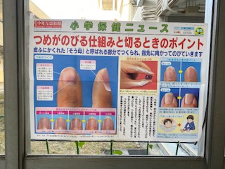 校内には「つめ」に関するポスターを掲示、17日月曜日発行したほけんだよりにも記事が大きく載っています。これらの資料を参考に上手につめを整えてください。