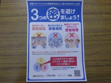「令和2年4月7日(火曜日)から5月6日(水曜日・振替休日)までの期間について、新型インフルエンザ等対策特別措置法に基づく「緊急事態宣言」が発せられました。府民の皆さまには、「外出の自粛」と「イベント開催の自粛」を要請します。これまで以上に、「3つの密(密閉・密集・密接)」を避け、「感染しない」「感染させない」ための行動をお願いします。」大阪府ホームページより