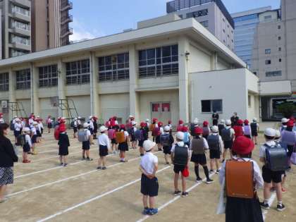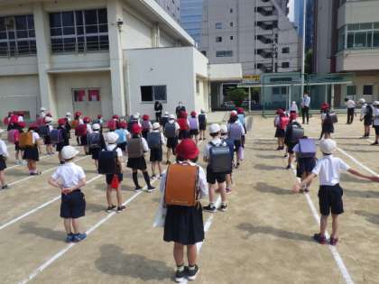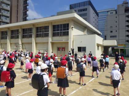 間隔をとって並び、校長先生から新しく明治小学校にきた先生の紹介と担任の先生の紹介をしました。