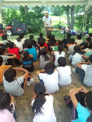 登山の後は、昼食のカレー作りです。宿舎の方から説明を受けています。