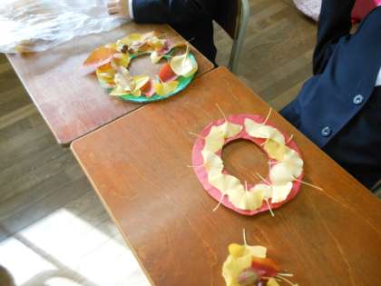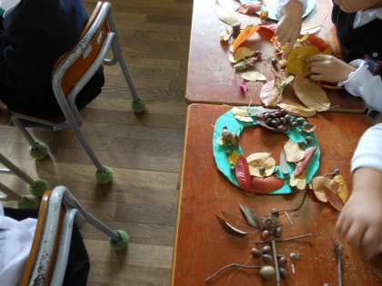 ドーナツ型に切った段ボールに色画用紙を貼り、そこに落ち葉やどんぐり木の枝などを貼り付けていきます。