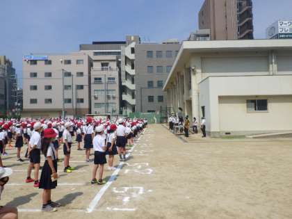 今年度、初めてみんなそろっての着任式と始業式が、運動場でソーシャルディスタンスを意識しながら行われました。