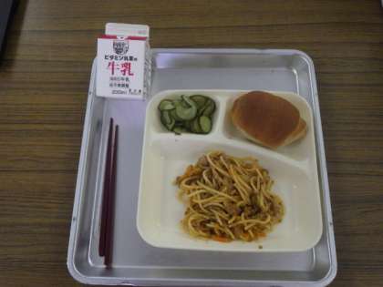 今日からは通常の給食です。みんな大好きなミートスパゲティでした。