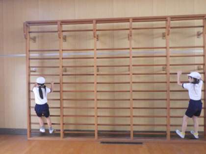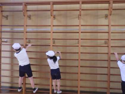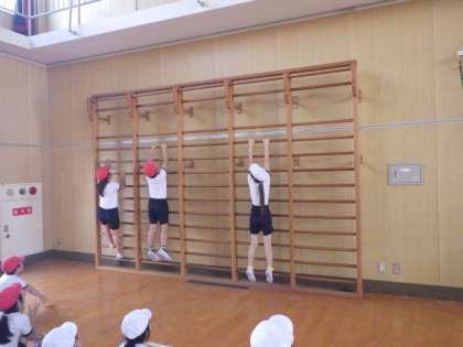 体育館のろくぼくを使って、ぶらさがりの運動や横移動などをしました。