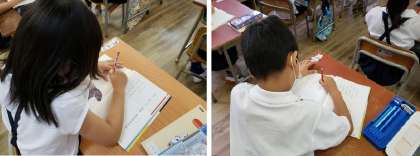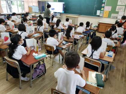 1年生の教室では国語の学習です。教科書を立てて持ち、みんなで声をそろえて音読していました。そして、文中の大事な言葉を見つけて、その言葉を赤鉛筆で囲み、印をつけていました。1年生の言葉の力もぐんぐん伸びています。