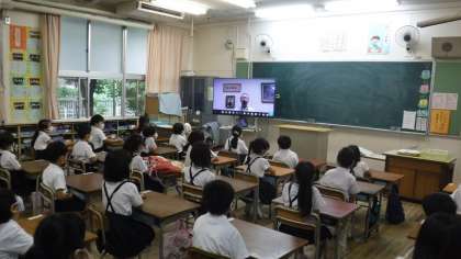 全校児童が集まることがないように、児童朝会はオンラインでおこなっています。