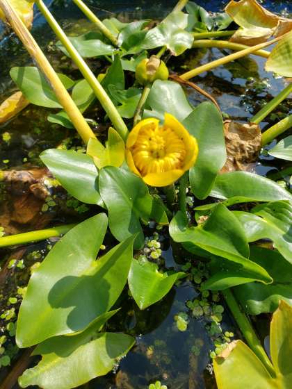 「コウホネ」は、スイレン科の植物で、水生の多年生草本です。浅い池や沼に自生し、夏に黄色い花を咲かせます。別名センコツ(川骨)ともよばれています。
