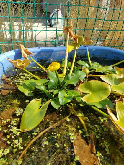 校庭の南東側の一角にある水槽を活用したミニビオトープで「コウホネ」の黄色い花が咲いています。