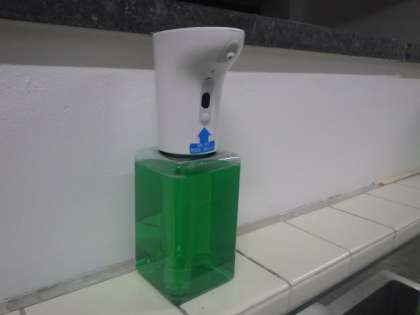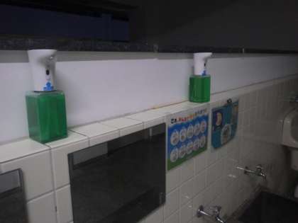 手洗い場の石けんをポンプ式から自動センサーに変更しました。