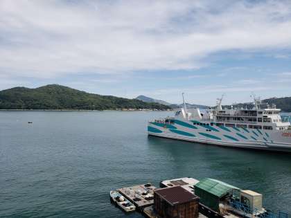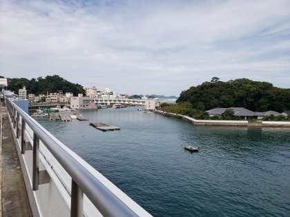 水族館屋上から見た鳥羽湾です。海は穏やかで、晴れ間も見えます。