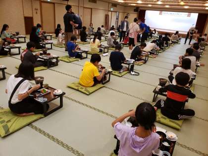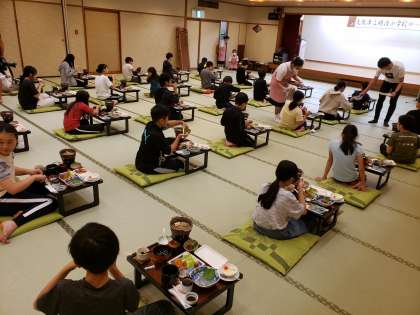 エビの皮のむき方がわからない子どもに先生たちが指南して回りました。
