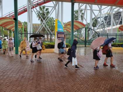 ナガシマスパーランドを後にしました。ただし、この後、バスの中で、男女に分かれて濡れた服を着替える予定です。そのため出発も多少遅れる可能性があります。