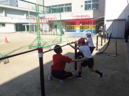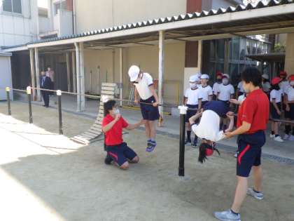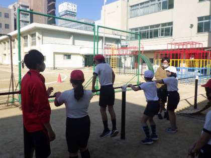 体操のインストラクターの先生に来てもらい、6年生で鉄棒の授業が行われました。