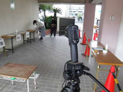 サーモグラフィは体温ではなく、体表温度を測定するものあることから、測定誤差を生じる可能性があり、正確に体温を測るためには、体温計での検温が必要であるという大前提のもと、多数の大人が来校する際に補助的に使用していきます。