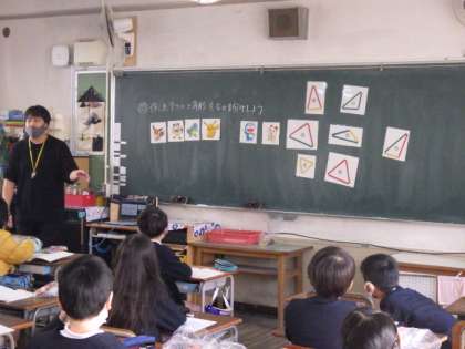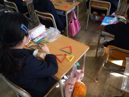 これまでに学習した辺や頂点の数、直角の有無などに着目し、三角形の学習をしています。