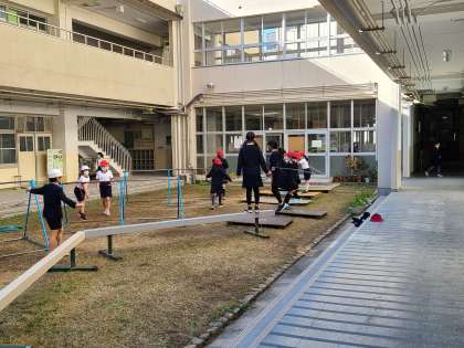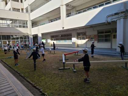 みどりの広場で、なわとびに取り組んでいます。休み時間も冬の体力づくりに励んでいます。
