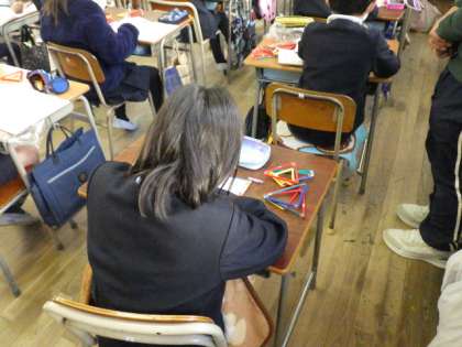 色の違うストローを使い、三角形の分類の仕方を考え、二等辺三角形や正三角形について理解しました。一人ひとり作業しながら、気づいたこともたくさんあったようです。