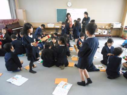 2年生は、みんなで合奏の練習をしました。ふだん音楽の学習で使っているカスタネットやタンバリンの他に、ギロやクラベス、ウッドブロックなどの楽器も使いました。