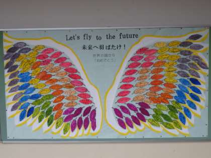 3年生横の掲示板には卒業生に向けて3年生が作ったお祝いのメッセージをはっています。