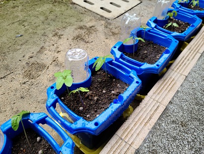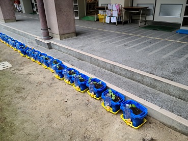 1年生の教室前に並べられているアサガオの鉢、それぞれ双葉が芽生えています。元気そうな様子でこれから成長するぞという感じです。花が咲くまで大切に育ててください、1年生の皆さん。