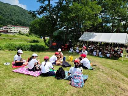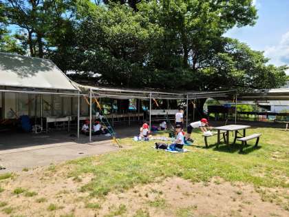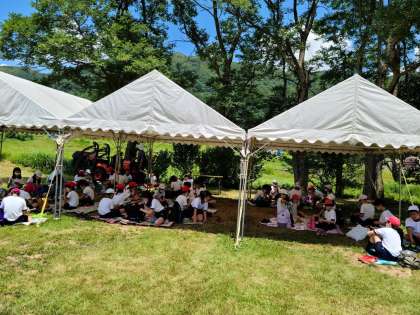 昼食タイムです。テントの日陰で食べるグループと日なたの草地で食べるグループとに分かれました。