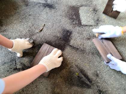 焦げた杉板を磨き、木目が鮮やかに浮き出るように取り組んでいました。