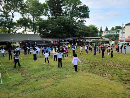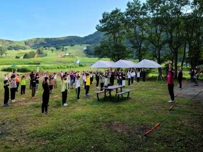 午前6時に起床した子どもたちは、午前6時30分、朝の会に集合してきました。体操、諸連絡などを聞いて、2日目のスタートです。