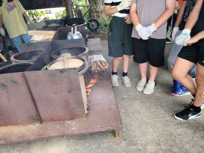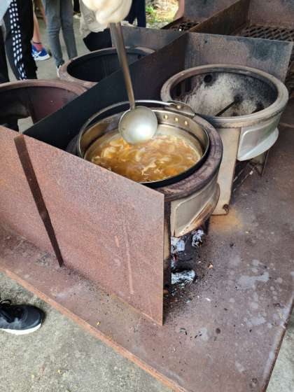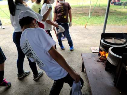 野外調理、かまどに鍋をかけて、ぐつぐつ。煙が目にしみながらも奮闘しています。
