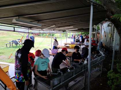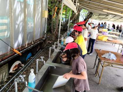 野外調理、鍋や器具の洗いものを手分けして行っています。特に鍋のすすやこびりついたカレーは、力を入れながら丁寧に洗わなければ、合格の出る仕上がりになりません。