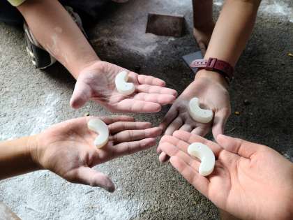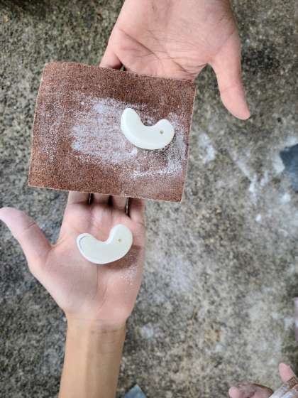 手のひらや服を削り粉で真っ白にしながら格闘しています。