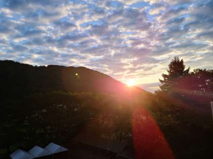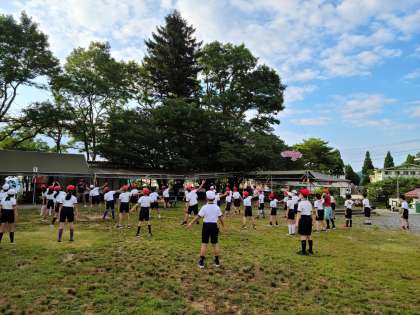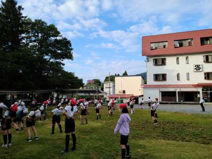 3日目の朝、元気に目覚め、朝の会でスタートです。高原の過ごしやすい気温の中、ラジオ体操で体を動かし、今日も力いっぱい活動します。