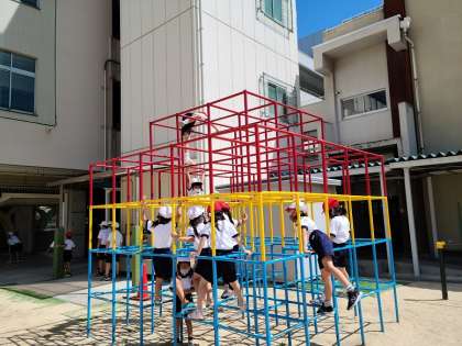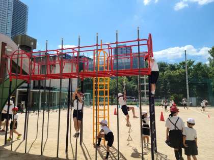 遊ぶ時には、マスク着用で、遊んだ後に教室へ入るときには石鹸を使っての手洗いが必須です。感染症対策を継続しながらの学校生活です。
