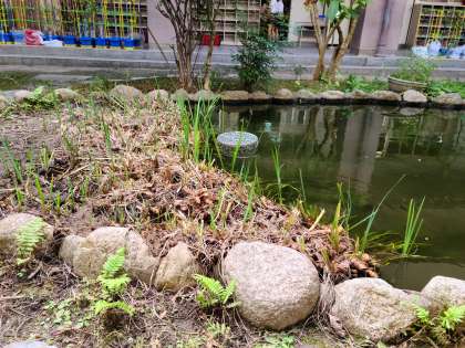 教材池の畔には、キショウブの大きな株があります。夏を過ぎた今は、葉が刈り込まれ、球根と短く伸びた新芽だけになっています。